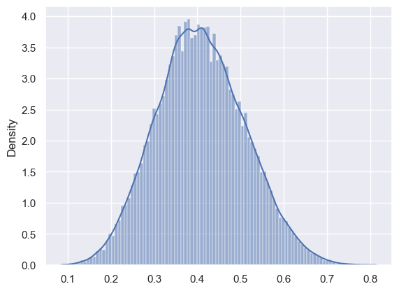 x=res.samples, weights=res.nweights, bins=100, stat="density", kde=True